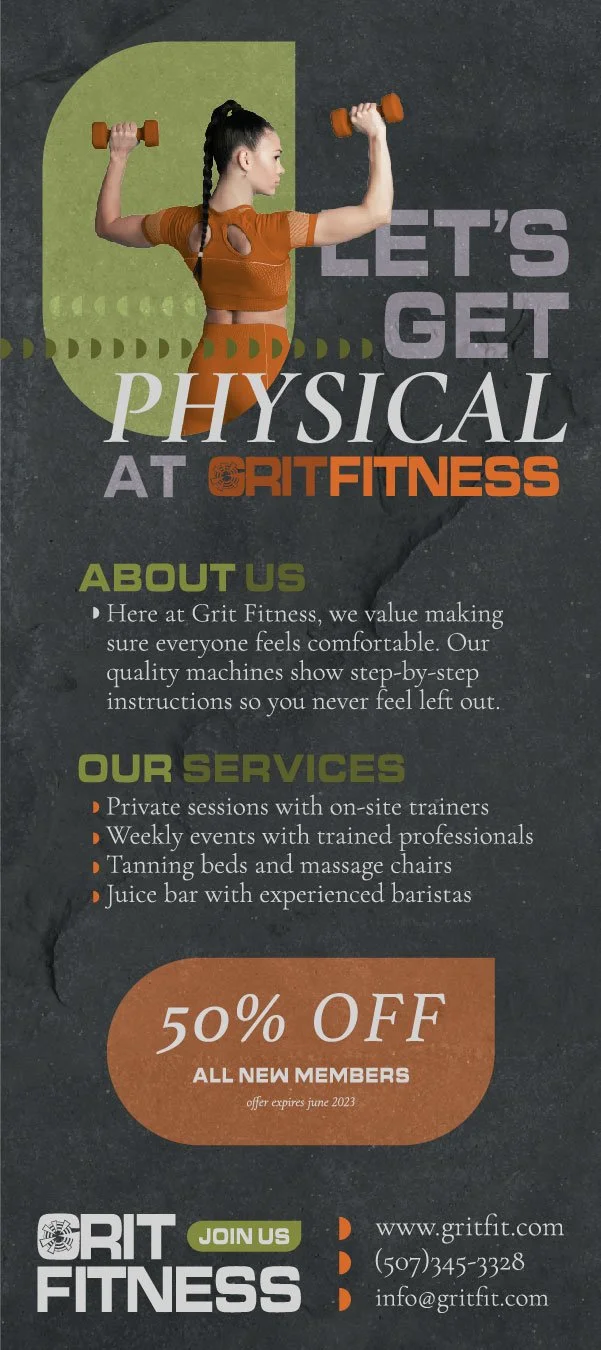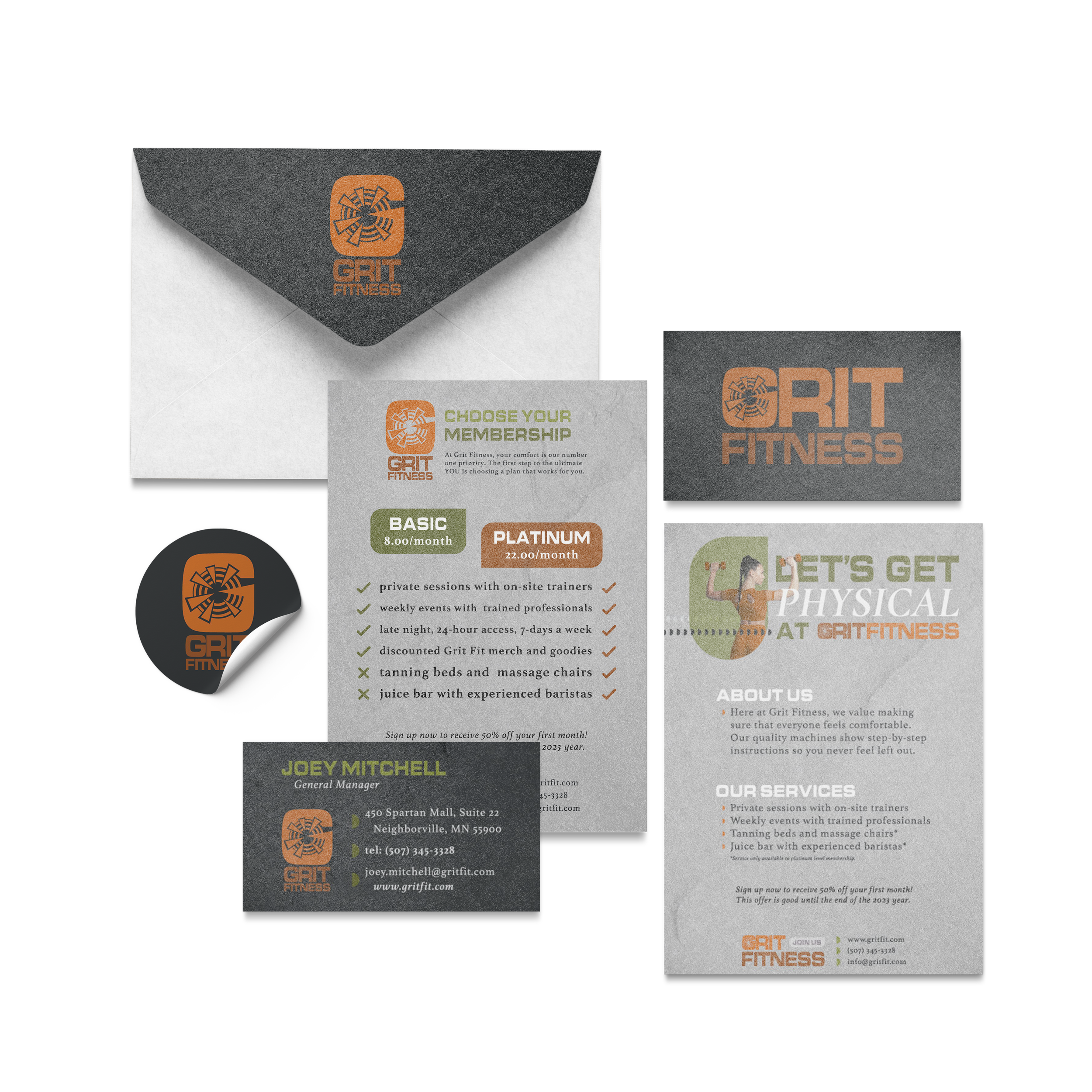 GRIT Fitness is a “come one, come all” type of gym. At an affordable rate, they invite those who are just starting their fitness journey and save space for those who are seasoned gym-goers. This project included not only a brand identity of color scheme and logo design, but also designs for deliverables like envelopes, stickers, business cards, and rack card.