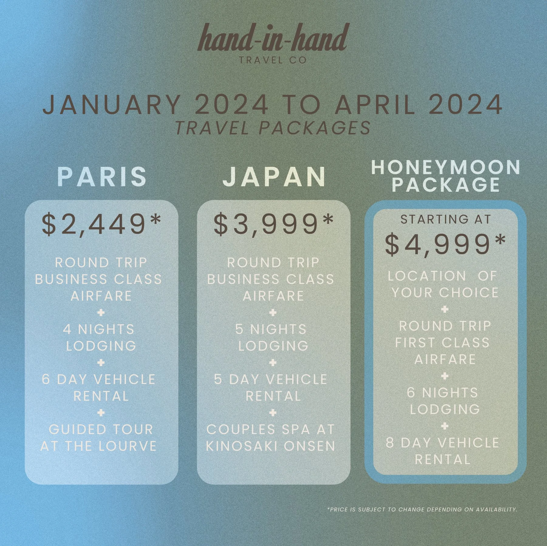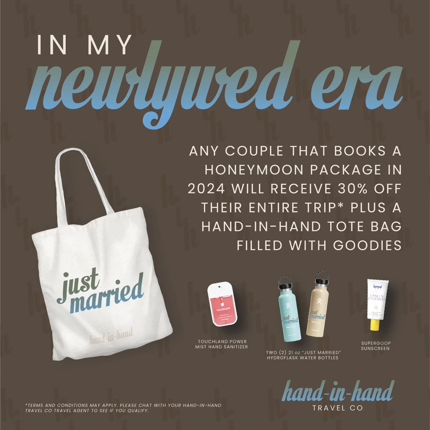 The process started by creating a logo and overall brand for Hand-In-Hand which includes a logo design, typeface choice and color palette. I used this project to test my research (notice the pricing on the travel packages page) and photo editing skills (I wanted them to all have the same aesthetic). I was very intentional with the photos I chose for the marketing material to exaggerate “hand-in-hand” couples. Lastly, since this brand is aimed at a younger crowd, I wanted to heavily lean in on trends that are popular now, hence the “newlywed era” graphic.